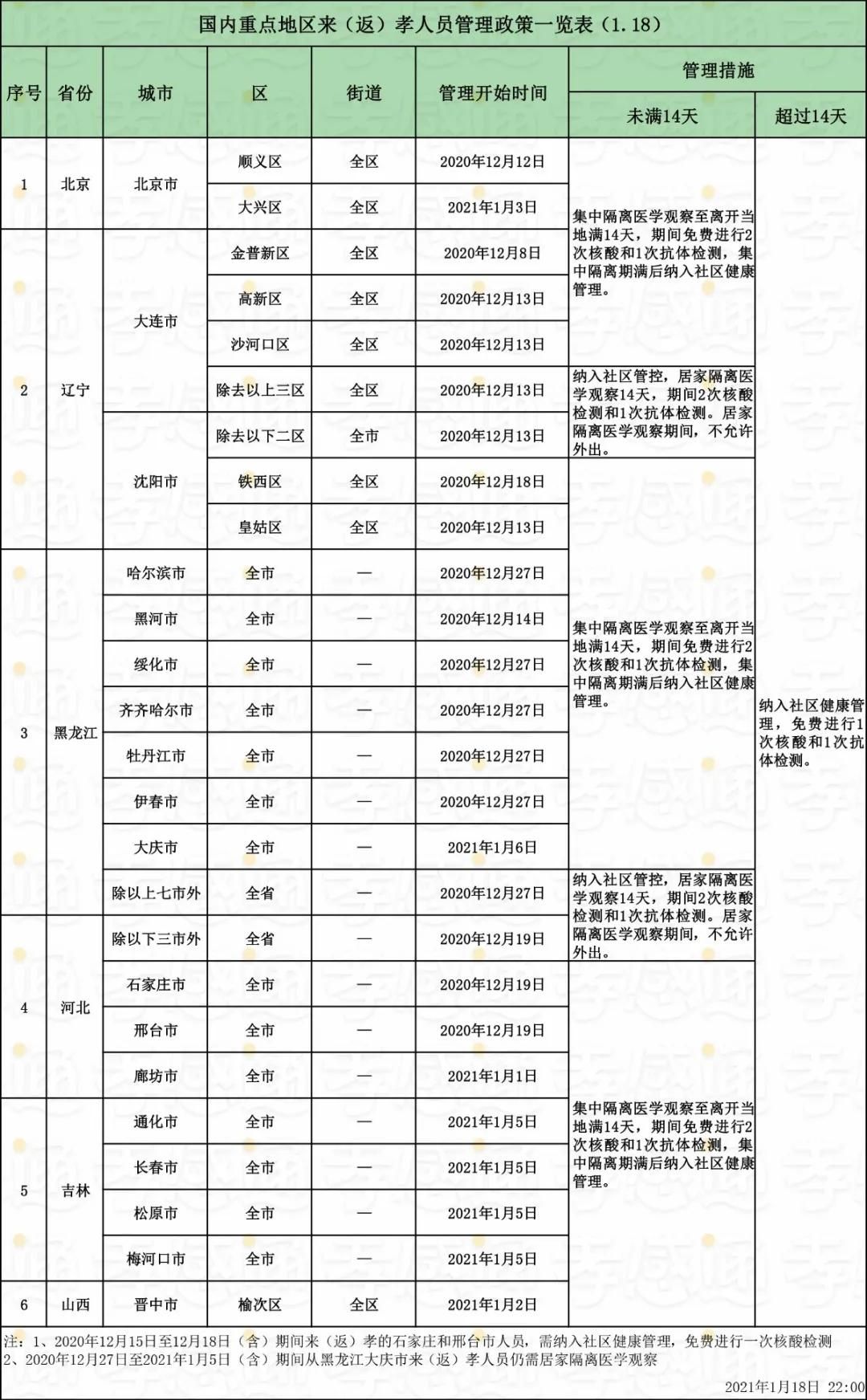 1月18日國內(nèi)重點地區(qū)來(返)孝人員管理政策: