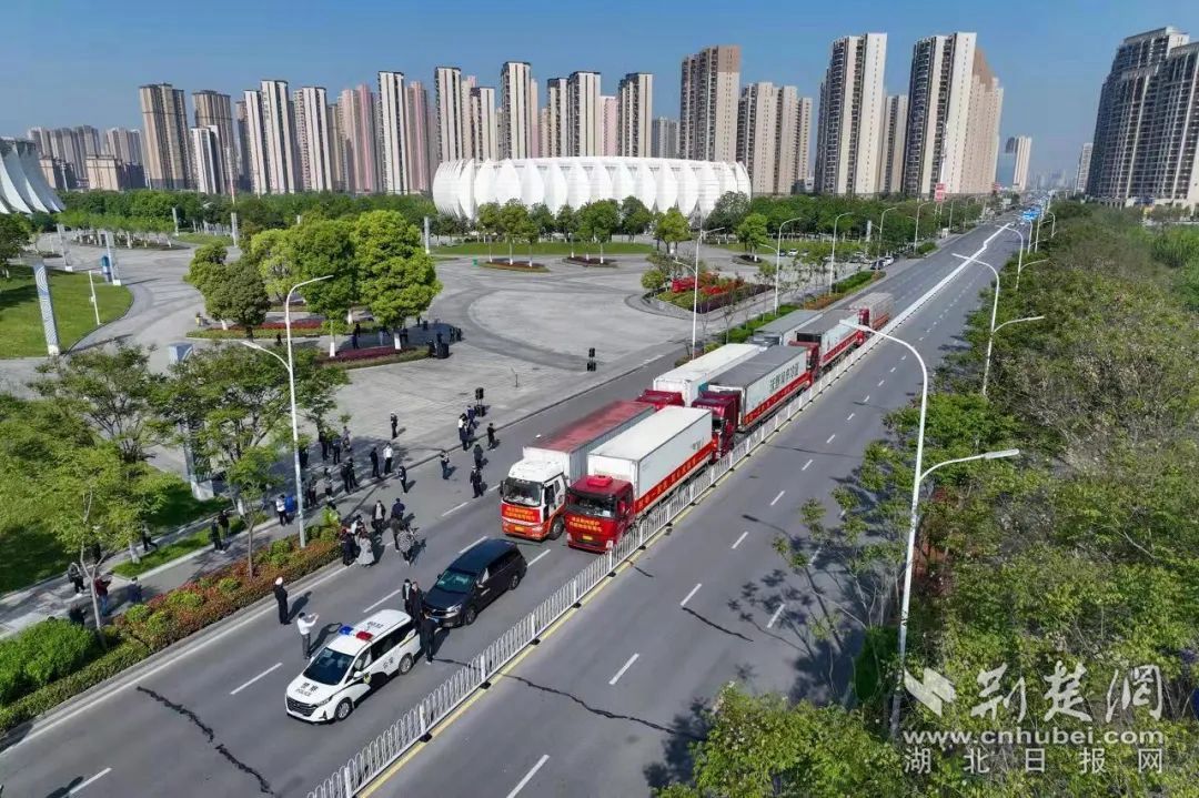 當(dāng)日上午,醫(yī)療專家和交警跟隊隨行,帶著637萬荊州人民的深情厚誼,奔赴1000多公里外的上海市,支援上海人民抗疫,溫暖守“滬”。發(fā)車現(xiàn)場,大家目送車隊離開,祝愿大家一路平安,早日返荊。