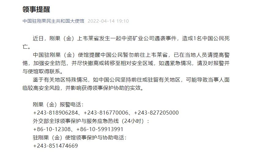 當?shù)貢r間14日,中國駐剛果(金)使館發(fā)布領(lǐng)事提醒稱,近日,剛果(金)上韋萊省發(fā)生一起中資礦業(yè)公司遇襲事件,造成1名中國公民死亡。
