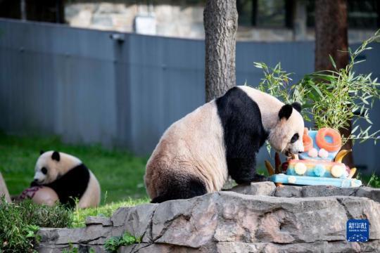 4月16日,在美國華盛頓史密森學會國家動物園,大熊貓“美香”(右)享用冰凍水果蛋糕。新華社記者 劉杰 攝