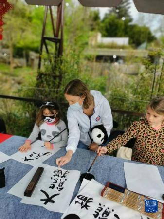4月16日,在美國華盛頓史密森學會國家動物園,游客體驗用毛筆書寫漢字“大熊貓”。新華社發(fā)