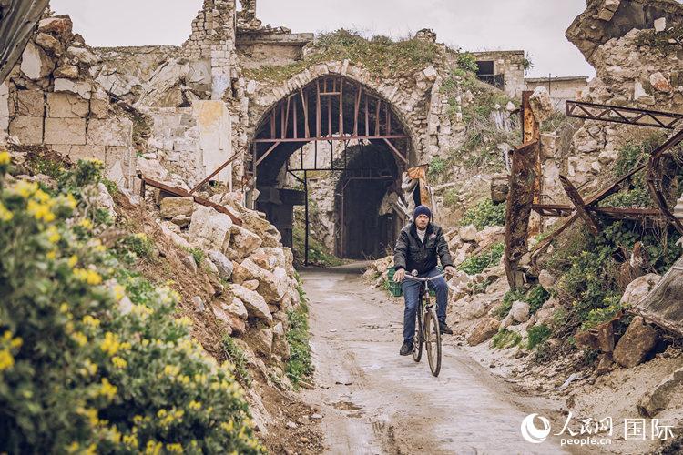敘利亞北部城市阿勒頗,一名男子騎車從被戰(zhàn)爭損毀的古老市場里經(jīng)過。2016年年底,敘政府軍從反對派手中完全收復阿勒頗。人民網(wǎng)記者 薛丹攝 |