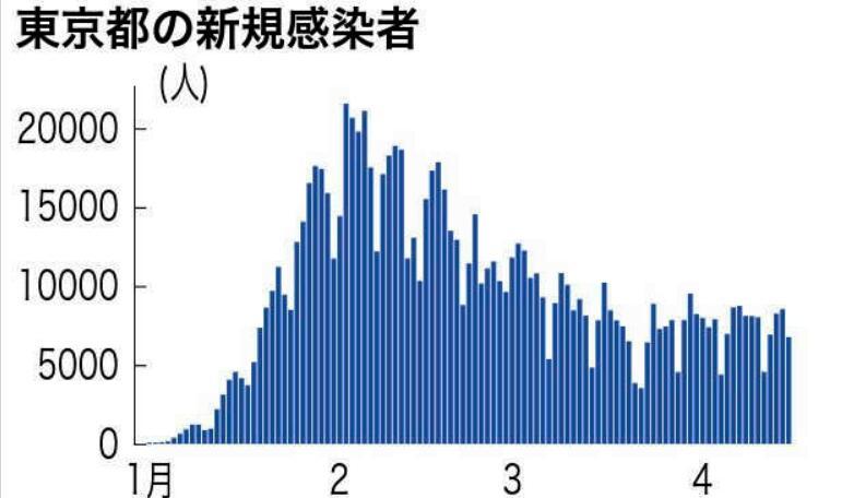 4月18日,東京都新增確診病例3479例,與上周一相比減少了1083例,連續(xù)七天呈下降趨勢。截至4月17日,東京都最近一周的日均新增確診病例數(shù)為6568.4例,是前一周的86.5%。