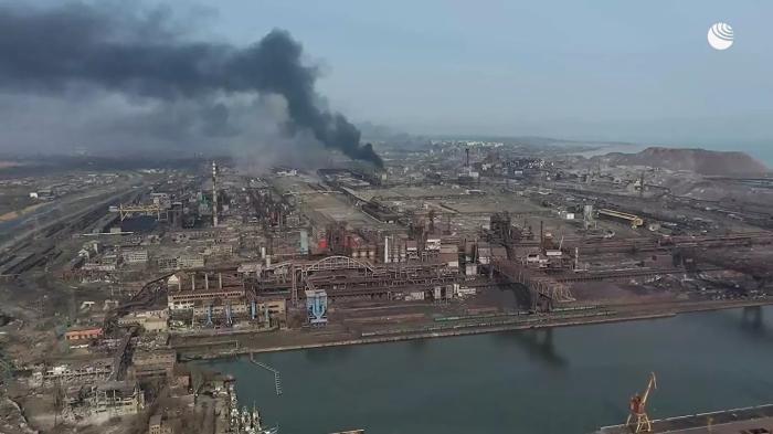 4月17日,航拍俄烏沖突中的亞速鋼鐵廠,當(dāng)?shù)厣鹨还珊跓煛D片來源:俄羅斯衛(wèi)星通訊社航拍影像