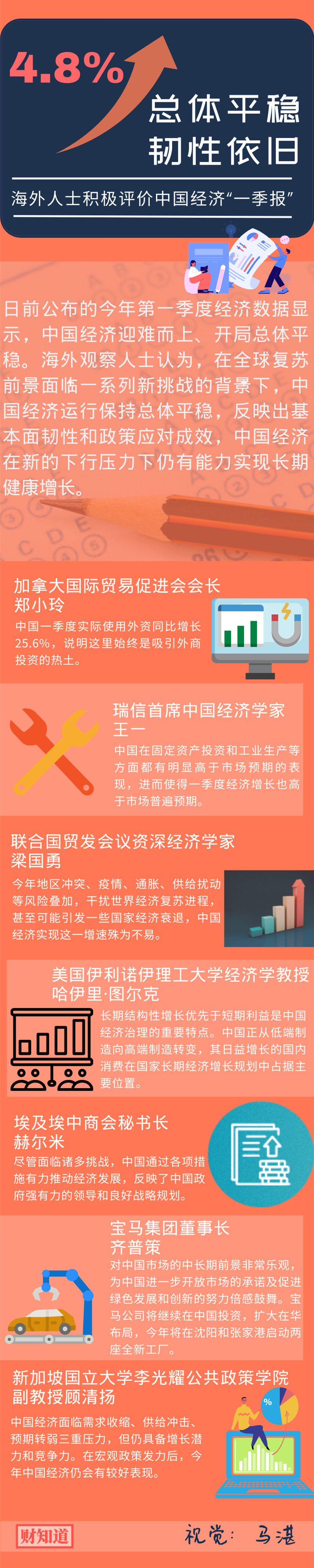 中國國家統(tǒng)計局18日發(fā)布的數(shù)據(jù)顯示,一季度中國經(jīng)濟(jì)同比增長4.8%。這一增速高于海外媒體和經(jīng)濟(jì)學(xué)家普遍預(yù)期,不少細(xì)分領(lǐng)域數(shù)據(jù)也顯現(xiàn)在多重風(fēng)險擾動下的中國經(jīng)濟(jì)之“穩(wěn)”。