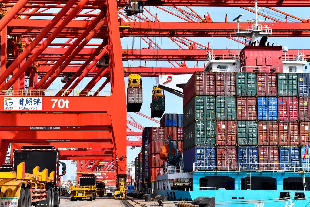 3月28日,卡車在山東港口日照港裝運集裝箱。(新華社記者郭緒雷攝)