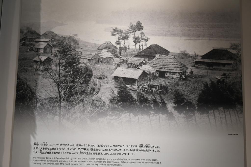 這是4月12日在北海道南部的“民族共生象征空間”拍攝的展示圖片,圖中顯示的是20世紀(jì)上半期的阿伊努人村落。(新華社記者華義攝)