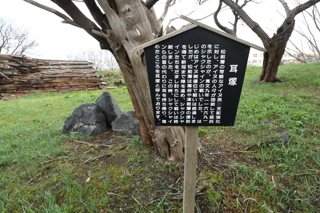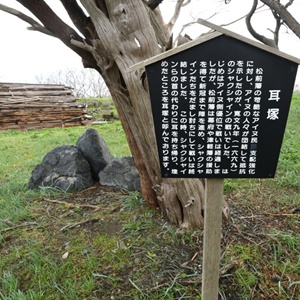 松前城下有一座三大塊黑石堆砌而成的耳冢。冢旁豎著一塊牌子介紹這座耳冢的來(lái)歷:面對(duì)松前藩對(duì)阿伊努族的殘酷壓迫,1669年,阿伊努人民團(tuán)結(jié)起來(lái)反抗,史稱沙牟奢允(阿伊努族首領(lǐng))之戰(zhàn)。阿伊努一方開始占有優(yōu)勢(shì),但松前藩得到幕府和津輕藩援助并將沙牟奢允誘殺。松前藩割下沙牟奢允等人的耳朵代為首級(jí)帶回,葬于此,故稱耳冢。