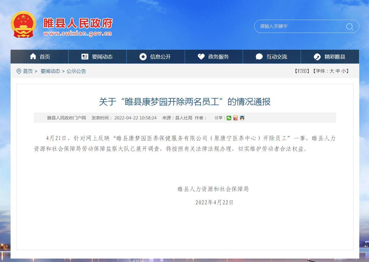 中新網(wǎng)4月22日電 據(jù)睢縣人民政府網(wǎng)站消息,河南睢縣人力資源和社會(huì)保障局22日發(fā)布通報(bào)稱,4月21日,針對(duì)網(wǎng)上反映“睢縣康夢(mèng)園醫(yī)養(yǎng)保健服務(wù)有限公司(原康寧醫(yī)養(yǎng)中心)開除員工”一事,睢縣人力資源和社會(huì)保障局勞動(dòng)保障監(jiān)察大隊(duì)已展開調(diào)查,將按照有關(guān)法律法規(guī)辦理,切實(shí)維護(hù)勞動(dòng)者合法權(quán)益。