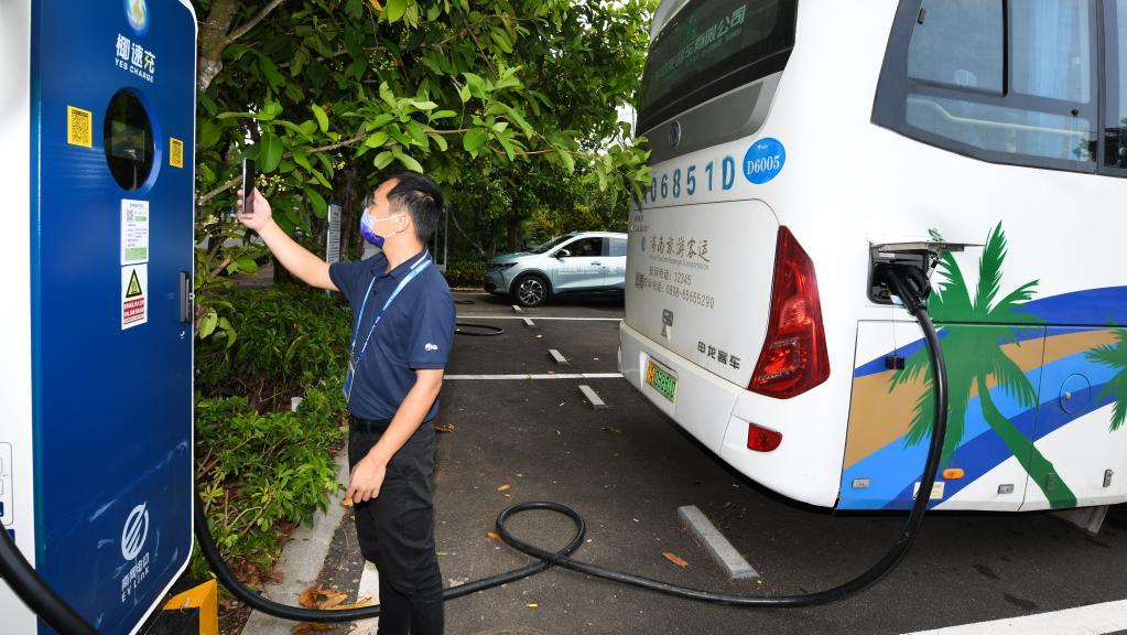 4月18日,工作人員在博鰲亞洲論壇國(guó)際會(huì)議中心附近為客車充電。新華社記者 楊冠宇 攝