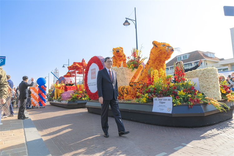 中方主題花車共有兩組,用2萬只鮮花精心裝飾,以慶祝中國(guó)和荷蘭建交50周年,向荷蘭公眾展示中國(guó)文化。今年是農(nóng)歷虎年,第一組花車以老虎為核心元素,取其正義、勇猛、威嚴(yán)的寓意。第二組花車載有中荷建交50周年標(biāo)志,象征荷蘭的風(fēng)車和象征中國(guó)的燈籠通過一座花橋連接,寓意通過花車巡游加深中荷文化交流。花車上還有中國(guó)大鼓現(xiàn)場(chǎng)表演及身著中荷傳統(tǒng)服裝的舞者,為花車巡游增添了更多亮點(diǎn)。