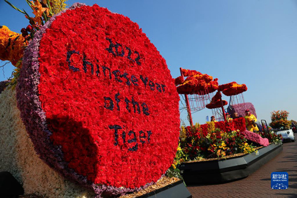 花車巡游隊伍當中,兩輛中國風主題花車格外引人矚目。海牙中國文化中心用2萬枝鮮花精心裝飾了兩組花車造型,慶祝中國和荷蘭建交50周年,向荷蘭公眾展示中國的虎年生肖文化。