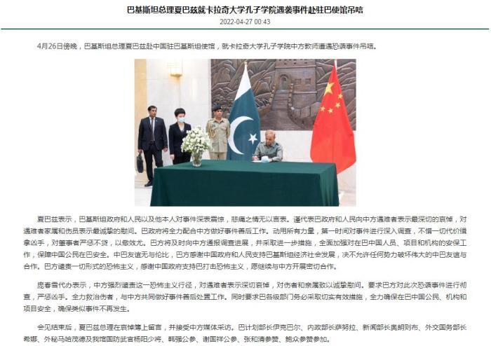 中新網(wǎng)4月27日電 中國(guó)駐巴基斯坦使館官網(wǎng)消息,當(dāng)?shù)貢r(shí)間4月26日傍晚,巴基斯坦總理夏巴茲赴中國(guó)駐巴基斯坦使館,就卡拉奇大學(xué)孔子學(xué)院中方教師遭遇恐襲事件吊唁。