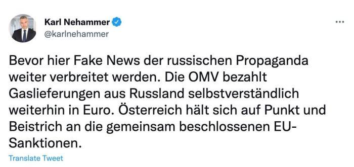 奧地利總理內(nèi)哈默27日通過其社交媒體表示,俄羅斯媒體關(guān)于奧地利以盧布支付俄天然氣的消息是假新聞。奧地利石油天然氣集團(OMV)仍然在用歐元為俄羅斯天然氣付款,奧地利將堅持執(zhí)行歐盟各成員國共同商定的對俄制裁措施。(總臺記者 易歆)