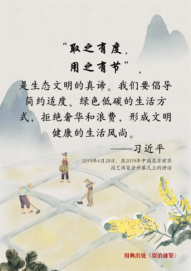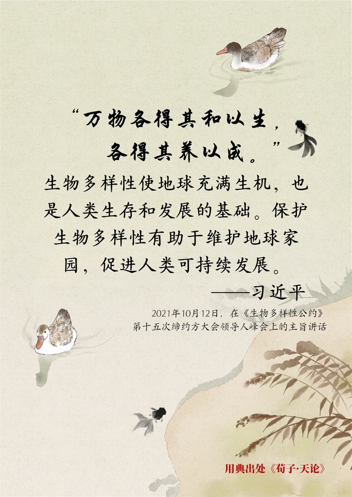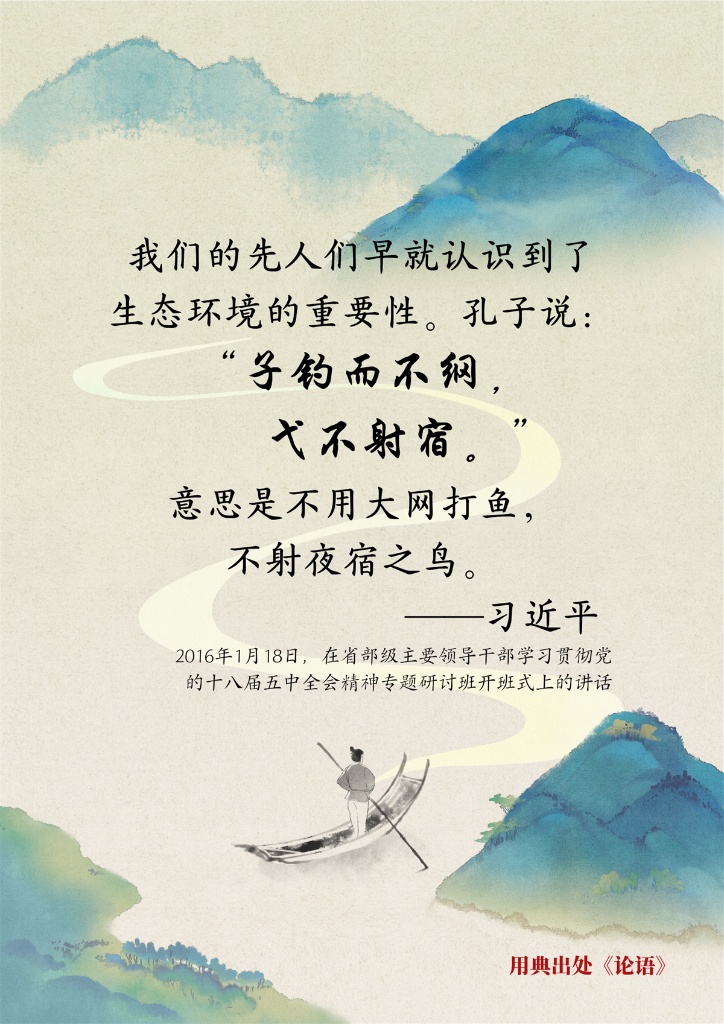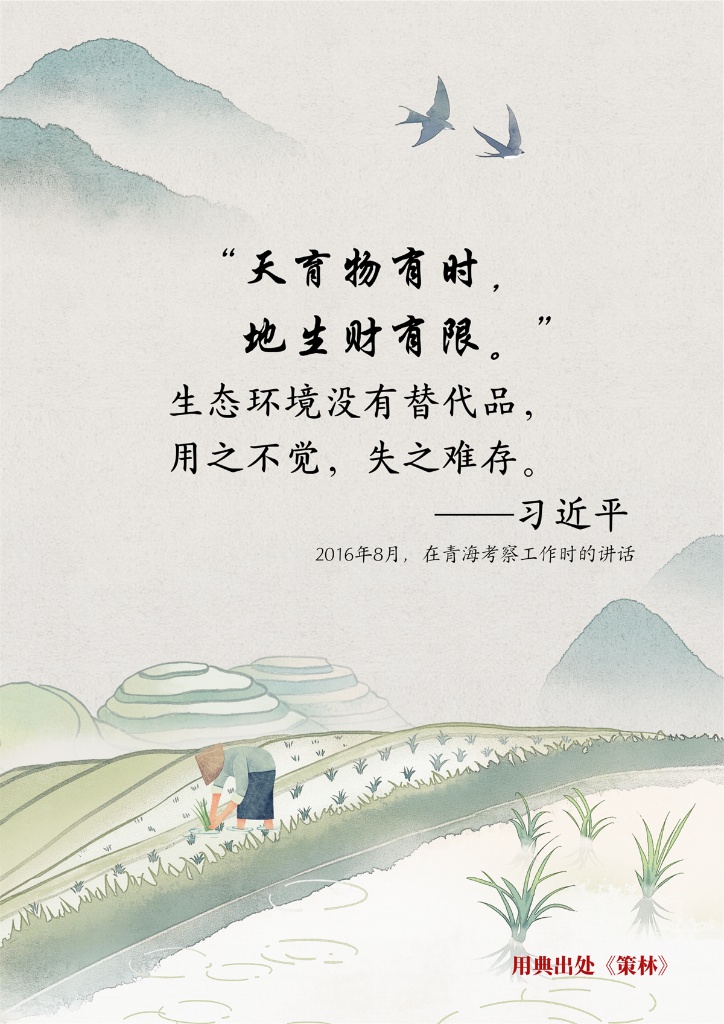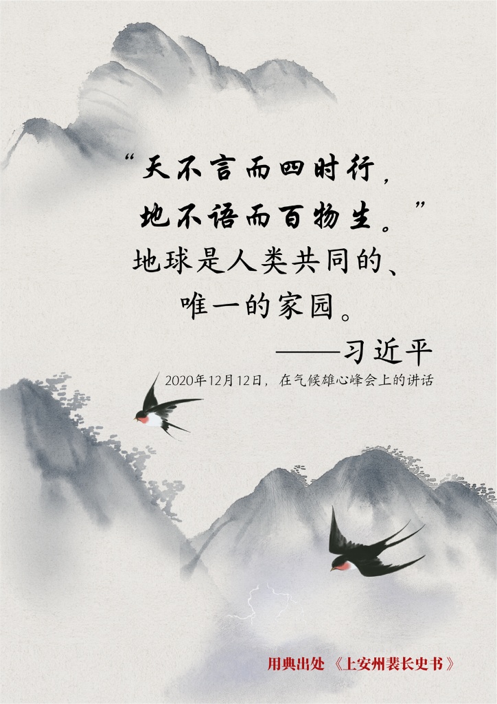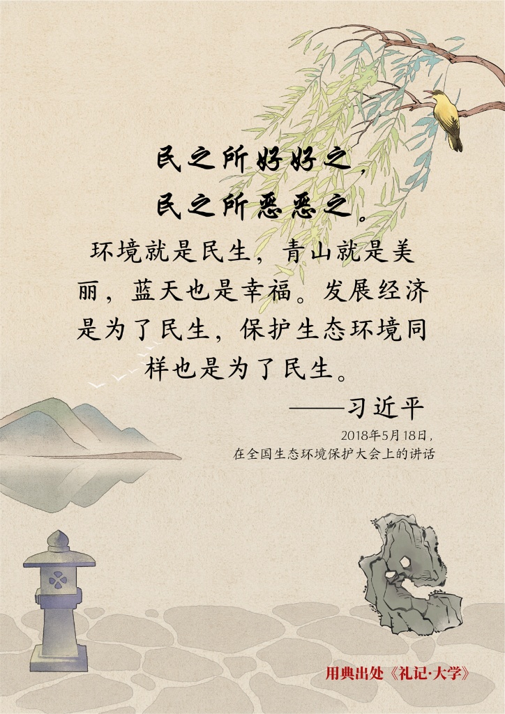 中華民族向來(lái)尊重自然、熱愛(ài)自然,綿延5000多年的中華文明孕育著豐富的生態(tài)文化。在國(guó)內(nèi)外多個(gè)場(chǎng)合,習(xí)近平多次引用中國(guó)傳統(tǒng)文化中的古典名句,為共建清潔美麗的世界“典”明中國(guó)智慧。