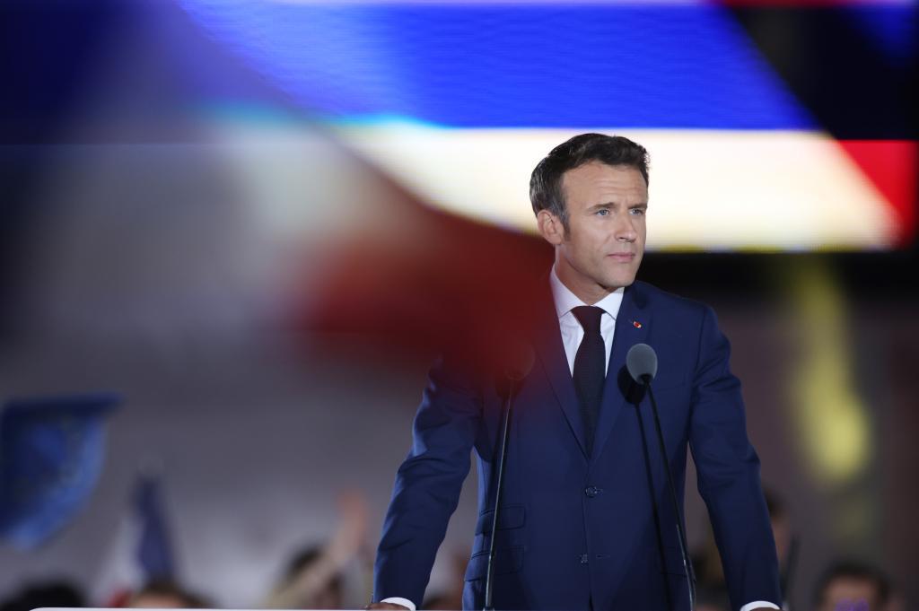4月24日,法國(guó)現(xiàn)任總統(tǒng)馬克龍?jiān)诎屠璩鱿x舉后的慶祝集會(huì)。新華社記者高靜攝