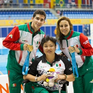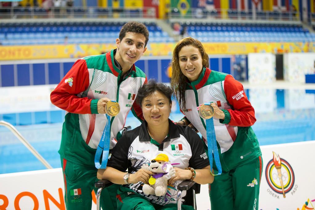 2015年7月11日,在加拿大多倫多舉行的泛美運動會上,男子跳水三米板比賽冠軍、墨西哥選手帕切科(左)和教練馬進(中)以及女子十米跳臺賽冠軍、墨西哥選手埃斯皮諾薩(右)合影。新華社發(fā)(鄒崢攝)