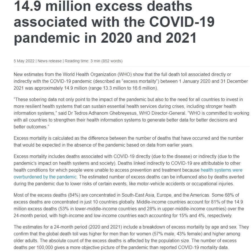 當(dāng)?shù)貢r(shí)間5月5日,世衛(wèi)組織表示,2020年1月1日至2021年12月31日期間,新冠肺炎疫情導(dǎo)致的直接或間接死亡人數(shù)約為1490萬(wàn)。世衛(wèi)組織將該數(shù)字稱為“超額死亡”,包括新冠肺炎死亡病例以及因衛(wèi)生系統(tǒng)及社會(huì)所受影響而導(dǎo)致的死亡。