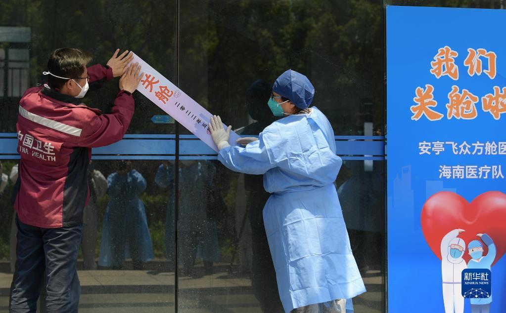 5月4日,海南省醫(yī)療隊(duì)領(lǐng)隊(duì)李文秀(左)和嘉定區(qū)衛(wèi)健委工作人員一起為安亭飛眾方艙醫(yī)院大門粘貼關(guān)艙封條。新華社記者 李賀 攝