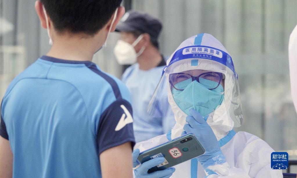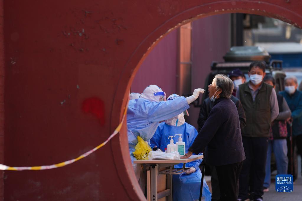 5月2日,在北京市朝陽區(qū)八里莊街道紅廟北里社區(qū),醫(yī)護(hù)人員在管控區(qū)為居民進(jìn)行核酸采樣。新華社記者 鞠煥宗 攝