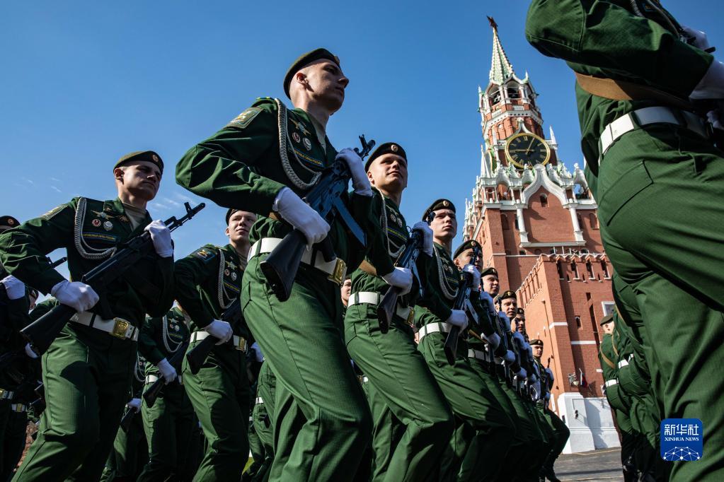 5月7日,在俄羅斯首都莫斯科,士兵在總彩排開始前列隊行進。新華社記者 白雪騏 攝
