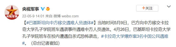 當?shù)貢r間5月9日,巴方向中方移交卡拉奇大學孔子學院班車遇襲事件遇難中方人員遺體。4月26日,巴基斯坦卡拉奇大學孔子學院班車在校內(nèi)遭遇自殺式恐怖襲擊,卡拉奇大學爆炸案3名中國公民遇難。