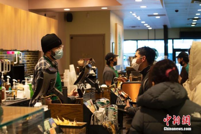 資料圖:當(dāng)?shù)貢r間2月10日,美國紐約市皇后區(qū)一家咖啡店人們戴口罩消費。中新社記者 廖攀 攝