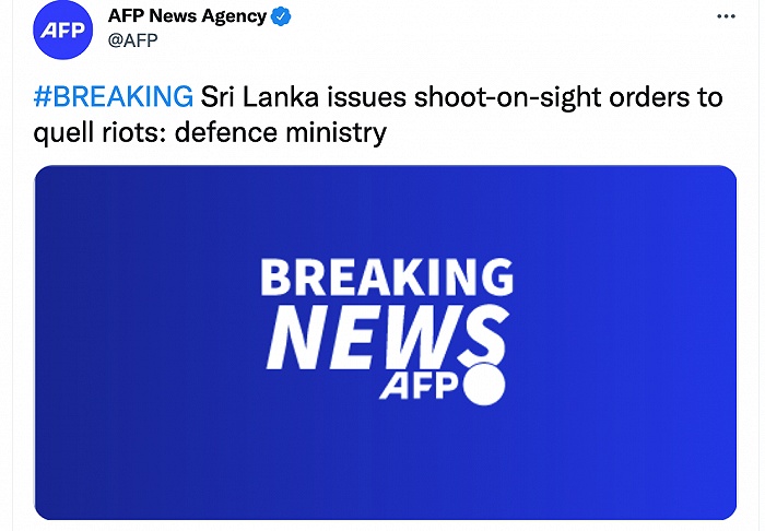 綜合CGTN,法新社5月10日報道,斯里蘭卡國防部發(fā)布“就地槍決令”以平息暴亂。斯里蘭卡國防部命令武裝部隊向任何掠奪公共財產(chǎn)或?qū)λ嗽斐蓚Φ娜碎_火。