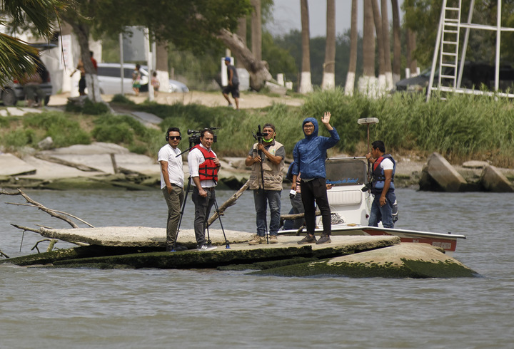 2022年5月2日,新華社駐墨西哥城記者在美墨邊境采訪,與新華社駐休斯敦記者隔河“相見”。(尼克·瓦格納攝)