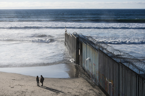 2019年1月10日,在墨西哥邊境城市蒂華納,游客在美墨邊境墻邊交談。新華社記者辛悅衛(wèi)攝