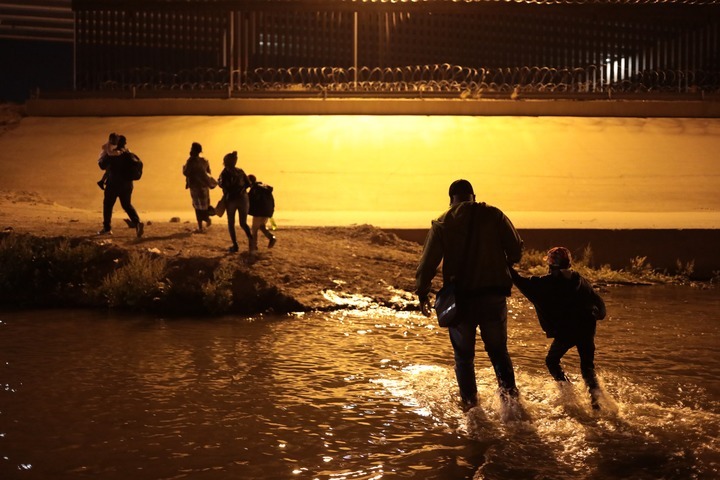 這是2021年3月30日在墨西哥邊境城市華雷斯一側(cè)拍攝的海地移民穿過(guò)布拉沃河從墨西哥試圖進(jìn)入美國(guó)。新華社發(fā)(佩納多攝)