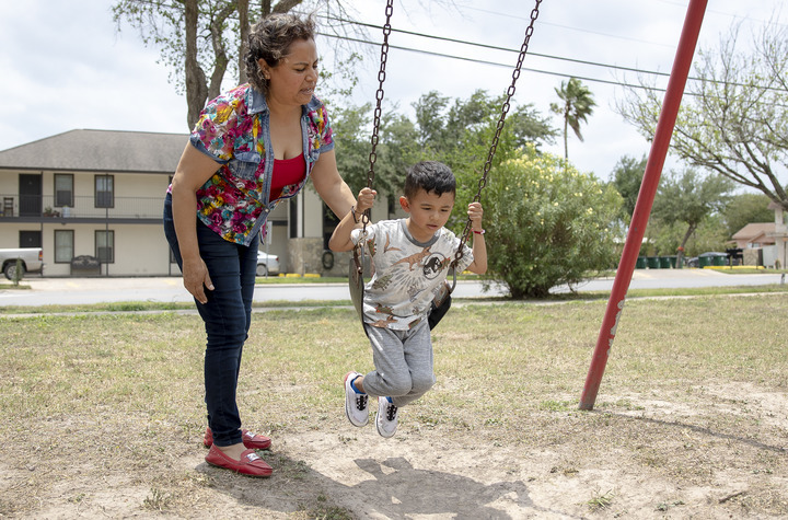 2022年5月2日,美國(guó)得克薩斯州伊達(dá)爾戈,來(lái)自墨西哥的女卡車司機(jī)薩拉·希門尼斯在推孫子蕩秋千。(尼克·瓦格納攝)