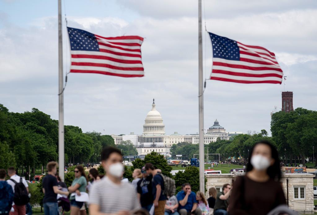 5月12日,在美國(guó)華盛頓,華盛頓紀(jì)念碑周圍的美國(guó)國(guó)旗降半旗悼念新冠逝者。新華社記者劉杰攝