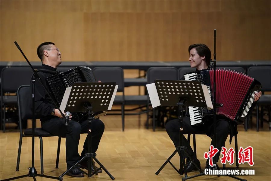 德國巴登符騰堡州青年手風(fēng)琴樂團(tuán)與北京樂海振聲手風(fēng)琴樂團(tuán)在北京共同登臺演奏。中新社記者杜洋 攝