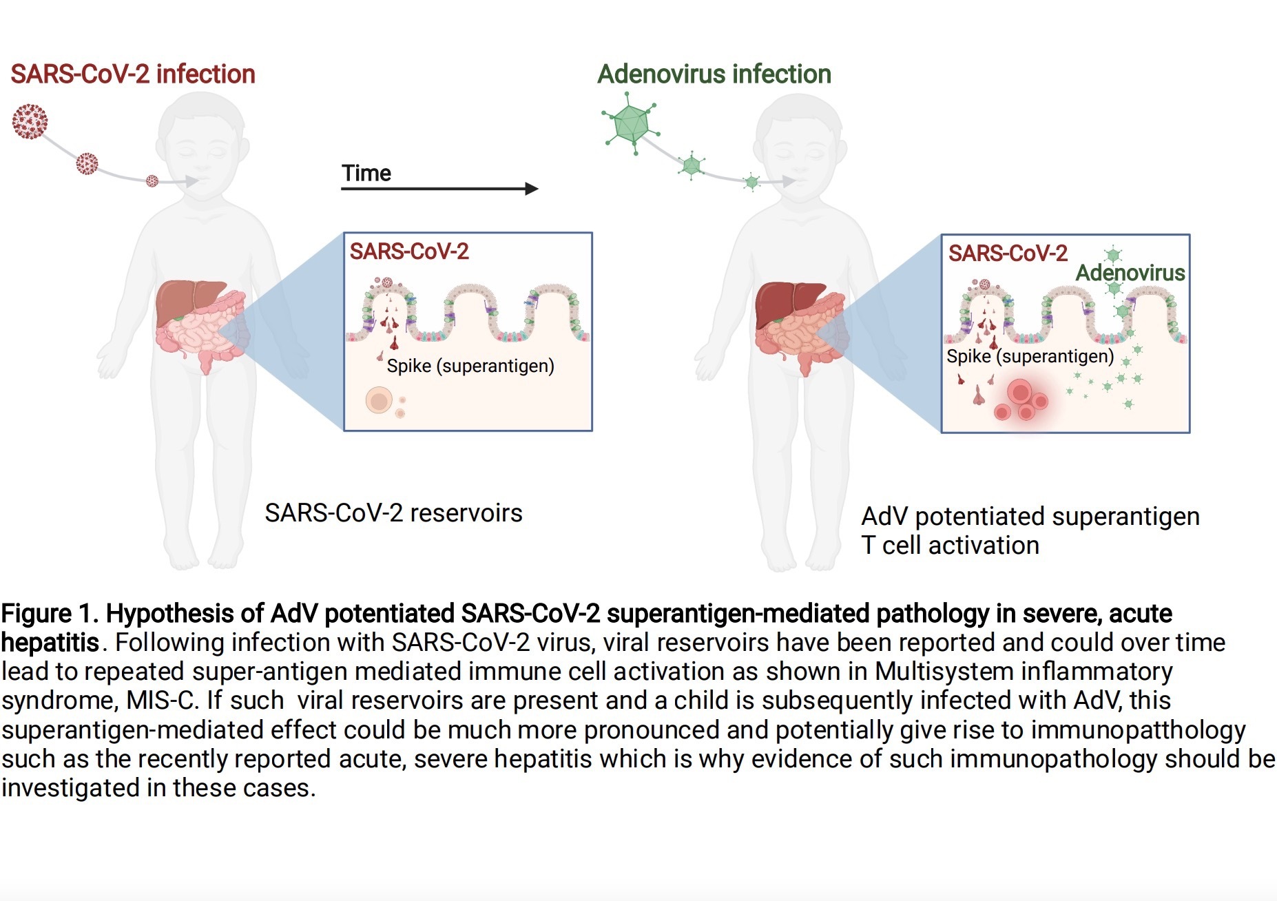 在感染新冠病毒后,病毒庫可能會(huì)隨著時(shí)間的推移導(dǎo)致反復(fù)的超級抗原介導(dǎo)的免疫細(xì)胞激活,如多系統(tǒng)炎癥綜合征(MIS-C)。如果存在此類病毒庫,并且兒童隨后感染了腺病毒(AdV),這種超抗原介導(dǎo)的影響可能會(huì)更加明顯,并可能導(dǎo)致免疫異常,如最近報(bào)告的急性重度肝炎,這就是為什么在這些病例中應(yīng)該調(diào)查這種免疫病理學(xué)的證據(jù)。