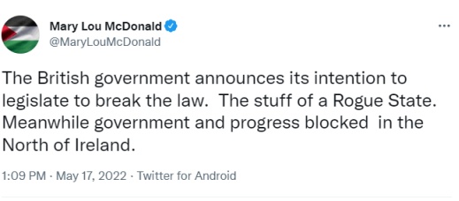 方案公布后,北愛爾蘭新芬黨領(lǐng)導(dǎo)人麥克唐納在其社交媒體平臺上第一時間表示,英國政府準(zhǔn)備用“立法”來“違法”。