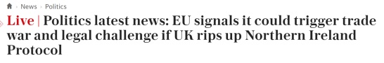 分析人士認(rèn)為,英國政府現(xiàn)在提出引入立法程序修改“北愛議定書”部分條款,頗具挑釁性。即以前簽的協(xié)議英國政府不想認(rèn)賬,要修改一部分內(nèi)容,而歐盟同不同意英政府也不愿顧及,因?yàn)橹灰ò附?jīng)過議會投票通過,就可以實(shí)施。英政府這個時刻宣布此做法,最重要的目的有兩個,一方面是要和歐盟玩“膽小鬼”游戲,就像兩輛在同一車道上相向而駛的汽車,各自都表現(xiàn)出自己不懼沖撞,賭對方先為自己讓步。另一方面,也給目前反對協(xié)議的北愛爾蘭民主統(tǒng)一黨一個保證,敦促其盡快和新芬黨聯(lián)合組建政府。
