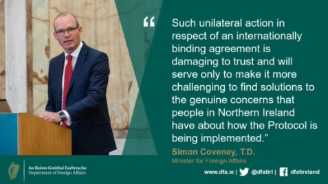 該事件中另外一個重要的參與方愛爾蘭的態(tài)度也非常明確,愛爾蘭外交部長西蒙·科文尼當(dāng)天稱,對英國政府準(zhǔn)備引入立法的決定感到非常遺憾,針對國際協(xié)議的單邊行動破壞了信任,這只會使解決北愛爾蘭民眾的關(guān)切變得更加困難。