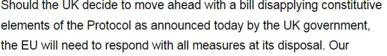 當(dāng)?shù)貢r間17日,歐盟委員會副主席塞夫科維奇針對英國外交大臣特拉斯的講話迅速作出聲明。在聲明中,塞夫科維奇稱,英國政府準(zhǔn)備引入立法聲明在法律層面不符合之前協(xié)議的要求。他認(rèn)為,“北愛爾蘭議定書”是英國和歐盟都已經(jīng)簽署的國際協(xié)議,單方面違反國際協(xié)議不可接受。如果英國政府像今天宣稱的那樣,決定繼續(xù)引入不符合“北愛爾蘭議定書”的法案,歐盟將采取一切可以使用的手段作出回應(yīng)。