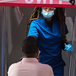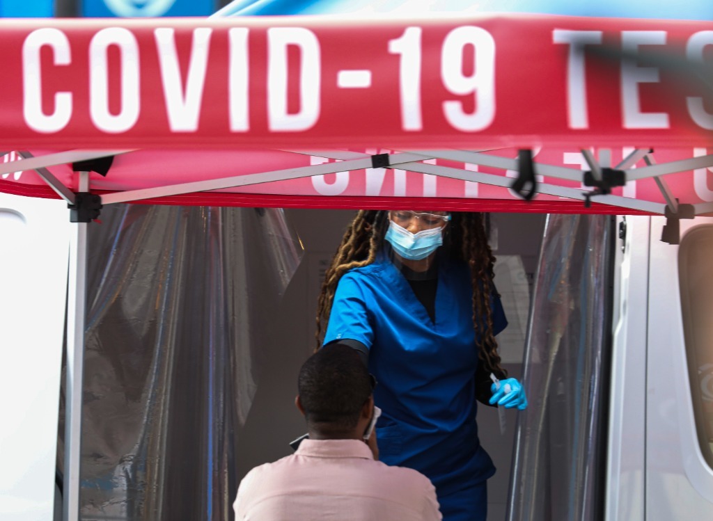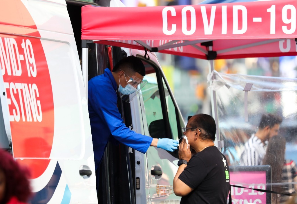 5月17日,一名男子在美國紐約時報廣場接受新冠病毒檢測。新華社記者王迎攝