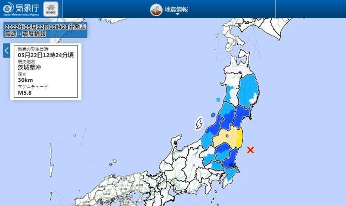 中新網(wǎng)5月22日電 綜合報(bào)道,日本氣象廳顯示,當(dāng)?shù)貢r(shí)間5月22日12時(shí)24分,茨城縣近海發(fā)生地震,推定為里氏5.8級(jí),震源深度30千米。