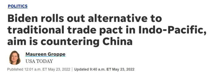 美媒報(bào)道拜登公布新的印太經(jīng)濟(jì)框架,目的在于對(duì)抗中國(guó)。圖片來(lái)源:“今日美國(guó)”網(wǎng)站報(bào)道截圖