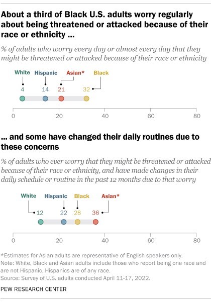 皮尤研究中心2022年4月中旬進行的調查數據顯示,受訪者中約有三分之一的黑人擔憂因種族原因受到暴力襲擊,而白人受訪者中這一比例僅占4%。圖片來源:皮尤研究中心官網