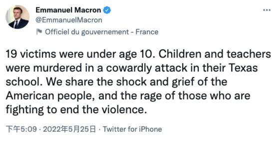 據(jù)報道,馬克龍在社交媒體上發(fā)文稱,“有19名受害者的年齡在10歲以下。在得克薩斯州一所學(xué)校里,學(xué)生和老師們在一次怯懦的襲擊中被殺害,我們和美國人民一樣感到震驚和悲痛,也與那些為結(jié)束暴力而戰(zhàn)的人一樣感到憤怒。”