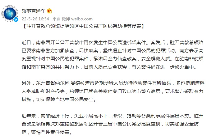 駐開普敦總領(lǐng)館提醒領(lǐng)區(qū)中國公民嚴防綁架劫持等侵害
