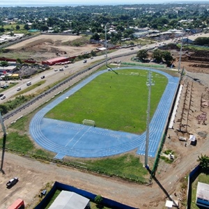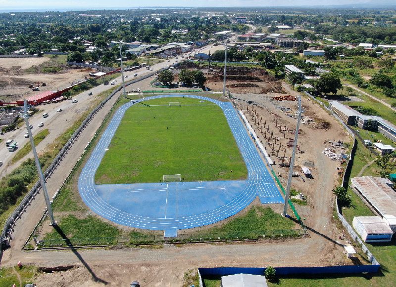 ↑這是5月4日在所羅門群島首都霍尼亞拉拍攝的中國援建的所羅門群島2023年太平洋運(yùn)動(dòng)會(huì)體育場(chǎng)館項(xiàng)目練習(xí)跑道和足球場(chǎng)(航拍照片)。