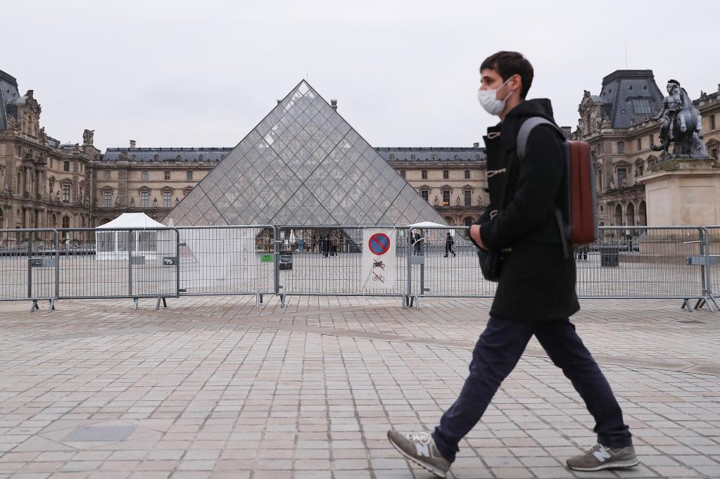 1月19日,一名男子走過法國巴黎盧浮宮的玻璃金字塔。新華社記者高靜攝