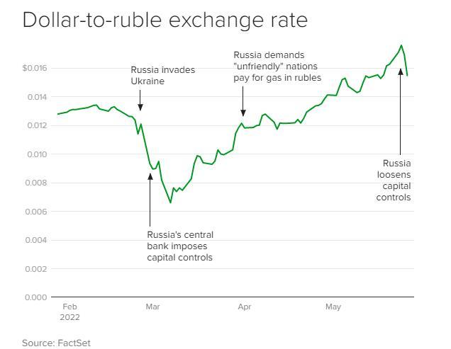 美元對盧布匯率的曲線變化(2022年2月至5月)。圖片來源:美國哥倫比亞廣播公司網(wǎng)站截圖