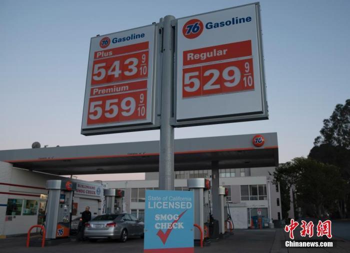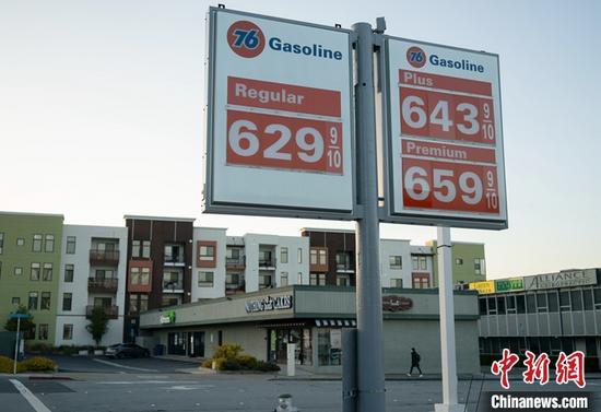 資料圖:當(dāng)?shù)貢r間5月16日,行人從美國加州圣馬特奧縣一家加油站油價牌附近經(jīng)過。 中新社記者 劉關(guān)關(guān) 攝