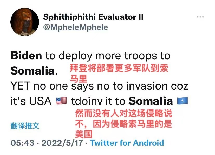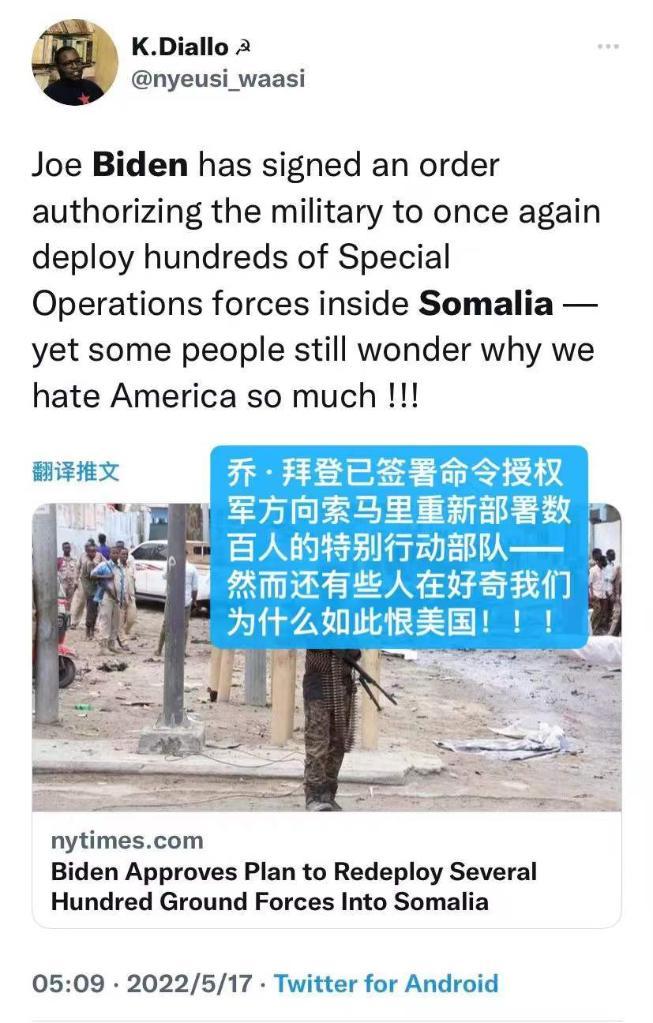 網(wǎng)友“K.Diallo”說(shuō):“喬·拜登已簽署命令,授權(quán)軍方重新在索馬里部署數(shù)百名‘特別行動(dòng)部隊(duì)’——然而還有些人好奇為什么我們?nèi)绱撕廾绹?guó)?。?!”